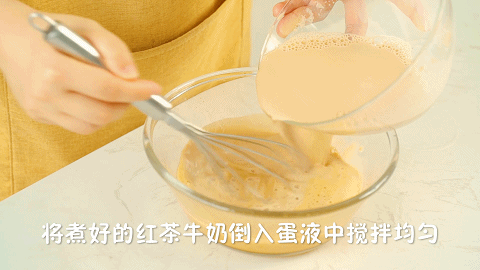 4、取420克煮好的红茶牛奶倒入蛋液中搅拌均匀,混合液就做好了(剩下的40克先留起来,之后会用在奶茶冻中)