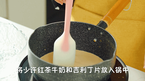 15、将步骤4中留出的40克红茶牛奶、吉利丁片放入锅中用小火煮沸,然后放置冷却备用