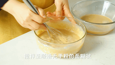 5、将混合液少量多次地倒入150克低筋面粉中,搅拌至顺滑无干粉的面糊状