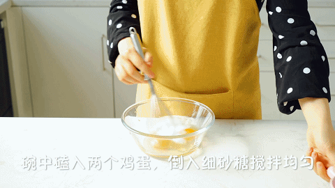 3、碗中磕入2个鸡蛋,倒入45克细砂糖搅拌均匀