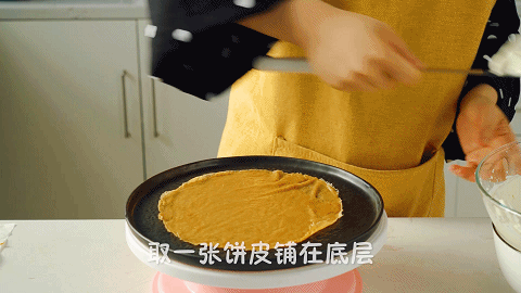 11、接着组装千层蛋糕:取一张饼皮铺在底部,在表面铺上一层奶油,按照一层饼皮一层奶油的顺序铺好