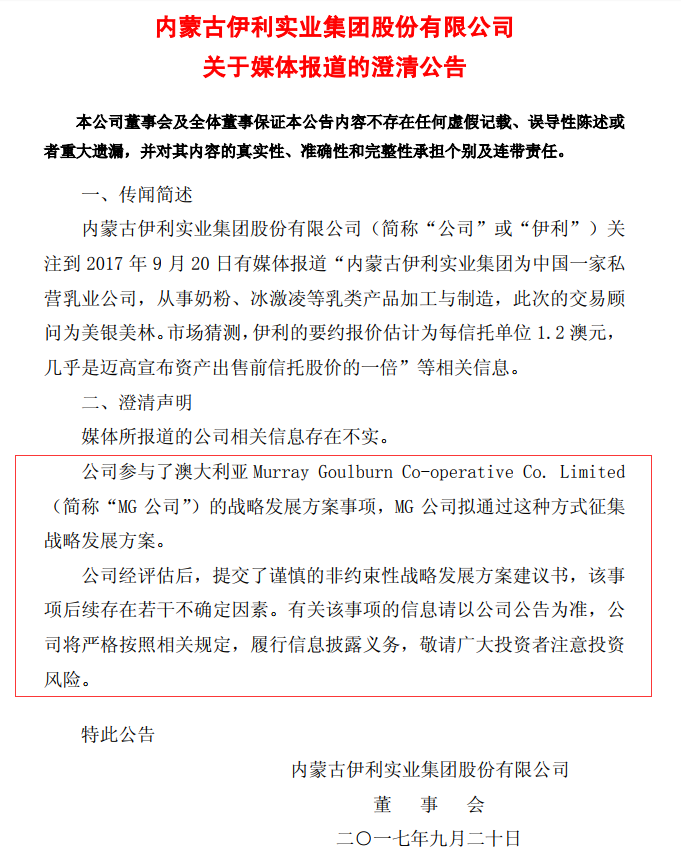 9月20日,伊利股份发布澄清声明称,的确参与了迈高的战略发展方案事项,经评估后提交了谨慎的非约束性战略发展方案建议书,并称,该事项后续存在若干不确定因素。蒙牛称,下属企业参与了非约束性报价。