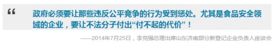2014年7月25日,国务院总理李克强在山东济南召开部分新登记企业负责人座谈会。在会上,李克强说,政府要严格监管,创造公平竞争的环境,让企业在竞争中公平、健康发展。“如果谁违反规则却没有受到应有的惩罚,这就打击了那些诚信守法、注重质量、讲求效益的企业,就会造成‘劣币驱逐良币’。因此,政府必须要让那些违反公平竞争的行为受到惩处。尤其是食品安全领域的企业,要让不法分子付出‘付不起的代价’!”李克强斩钉截铁说道。