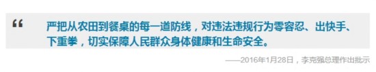 2016年1月28日,国务院总理李克强作出批示,他指出,保障食品安全仍面临艰巨任务,要毫不懈怠,持续攻坚。各级政府要坚持人民利益至上,切实发挥食安委统一领导、综合协调作用,以改革精神和法治思维,坚定实施食品安全战略,加快健全从中央到地方直至基层的权威监管体系,落实最严格的全程监管制度,严把从农田到餐桌的每一道防线,对违法违规行为零容忍、出快手、下重拳,切实保障人民群众身体健康和生命安全。