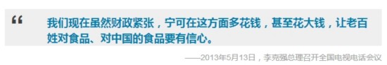 2013年3月17日,李克强总理在人民大会堂会见中外记者,并回答记者提问。有记者问,中国食品安全问题日益严重,中国政府将如何解决?总理说,食品安全,那可以说是天大的事,直接关系到人们的生活质量和身体健康。政府应该对假冒伪劣和黑心食品坚决进行查处,并且让不法分子付出昂贵的代价。总理还表示,不论是污染状况、食品问题,还是治理和处置的效果,都要公开透明,让公众、媒体能够充分有效地加以监督,“这也是形成一种倒逼机制,来硬化企业和政府的责任,也可以增强人们自身的防护意识”。他号召,“既然同呼吸,就要共奋斗,大家都尽一把力。政府则是要以更大的决心来让人民放心。”