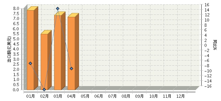 根据海关总署发布数据,2016年1~4月,全国食品行业累计完成出口额同比增长-3.76%。其中: 4月份完成出口额同比增长-7.59%。月度进口额及同比增长趋势如下图所示。