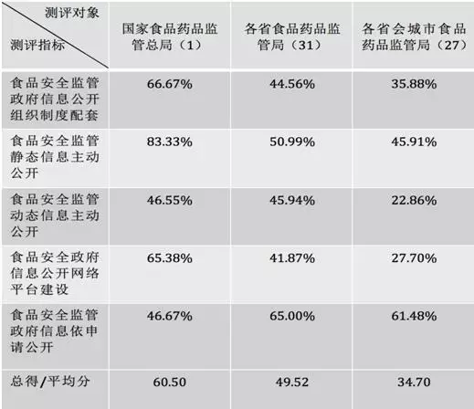 第一,在中央、省、市三级共59个评测对象中,除国家食品药品监督管理总局勉强及格外,31个省级食药局中只有6个及格,27个省会城市食品安全监管部门无一及格。换算成百分比,此次测评的及格率为1.7%。