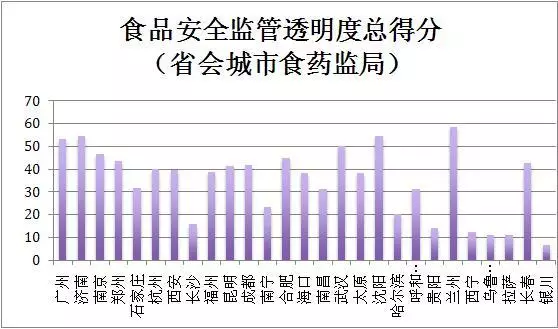 27个省会城市食药监管局透明度最高的是兰州58.5分,济南和沈阳54.75分并列第二。最低的为乌鲁木齐、拉萨和银川,最低为6.5分。没有一个省会城市食药局的透明度达到及格线,50分以上有五个,十四个在40分以下,六个在20分以下。如前所述,我国食品安全监管信息公开是越到基层越差。