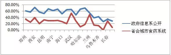 省会城市食药局在这些信息项上的透明度则显著更低:分别为34.44%、24.44%、21.48%和32.10%。在各项动态信息中,透明度最低的是食品召回信息:27个省会市局全体挂零,省局中也仅有上海在2015年1月4日公开福喜食品有限公司的召回信息,以及新疆于2014年10月30日公布乌苏市古尔图镇御宾酒厂的召回信息,得分率0.48%。