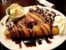两边都翻和烤的瘦而大的薄煎饼,将馅料如巧克力、水果或可口奶酪和炒的蔬菜裹在里面折叠。面糊很简单,由面粉、糖、鸡蛋和牛奶制成。这种配方是带布朗榛子黄油的温的法式煎饼。