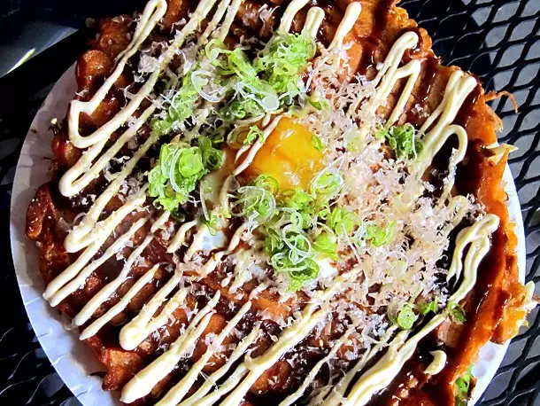 御好烧这种美味的煎饼,来自单词okonomi,意思是“你想要什么”,“Yaki”意思是烤的。它是由面粉、鸡蛋、卷心菜组成,同时加上任何你想要的各种配料。