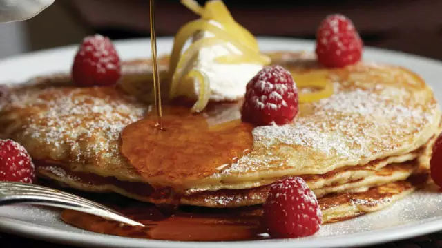 这些经典薄煎饼经常与黄油和糖浆(当然,如果是加拿大人,是纯糖浆)一起作为早餐吃。其厚而松软的标志性秘笈是:发酵粉。与鸡蛋、酸奶、糖和面粉混合一起,发酵粉使得薄煎饼涨成高高的圆床。
