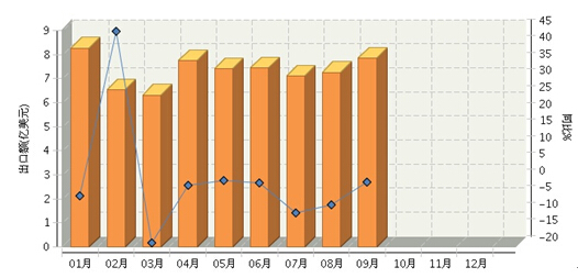 2015年1~9月,全国食品行业累计完成出口额65.88亿美元,同比下降2.15%。其中:1月份完成出口额8.27亿美元,同比下降4.66%;2月份出口额6.52亿美元,同比增长44.63%;3月份出口额6.31亿美元,同比下降18.71%;4月份出口额7.75亿美元,同比下降1.54%;5月份出口额7.41亿美元,同比下降0.1%;6月份出口额7.44亿美元,同比下降0.74%;7月份成出口额7.1亿美元,同比下降9.91%;8月份出口额7.25亿美元,同比下降7.41%;9月份出口额7.85亿美元,同比下降0.48%。从各月份出口情况来看,除2月份出口高速增长外,其他月份均为负增长。