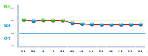 图 2014年8月~2015年9月中轻食品景气指数变化态势