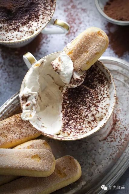 将马斯卡彭( Mascarpone )奶酪打成奶油状,再加入奶油、糖和咖啡酒搅厚即可。撒上可可粉,再搭配松脆饼干,完美的下午茶时光。