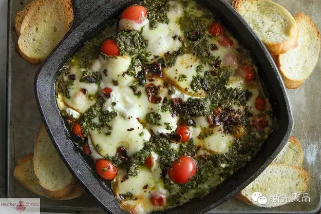 这道美味适合喜欢奶酪的朋友。放入小番茄、辣椒粉、培根和山羊奶酪在烤箱烤,再盖上一层苏里拉奶酪片,最后撒上一些罗勒酱。当然,法棒是不错的搭配。