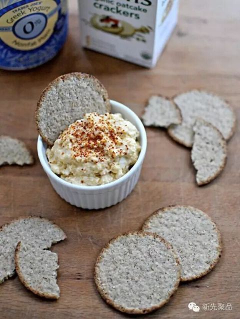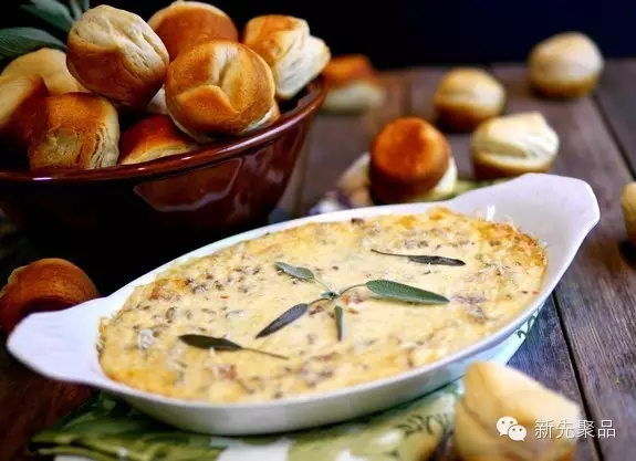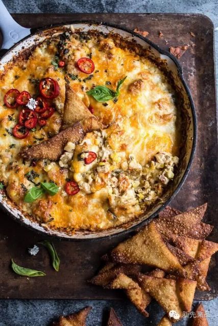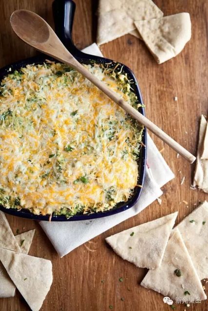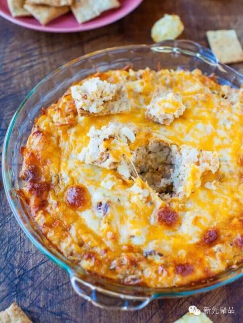 蛋黄酱、酸奶油、芝士和干酪一起放在烤箱烤,可以再放些蟹肉和蒜粉。配合薄饼既美味又开胃!