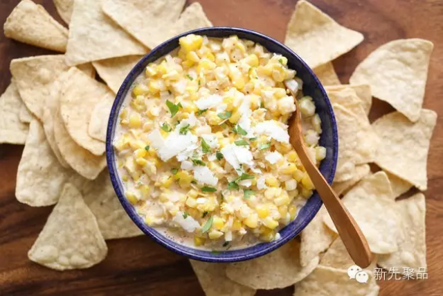 将蛋黄酱混合柠檬汁、香菜和胡椒粉,搅拌光滑后再和玉米粒一起煮出香气。最后别忘了,玉米片和玉米沙司才是绝配!