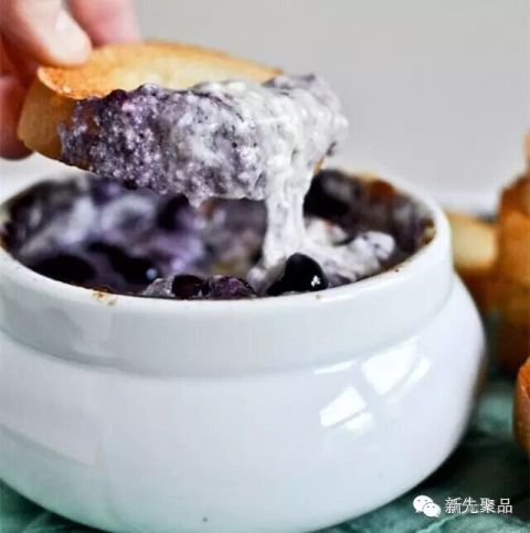 将干酪、蓝莓以及软化的芝士烤熟再捣碎,形成热的蓝莓蘸酱,再配合新鲜出炉的烤面包,想想就很可口!