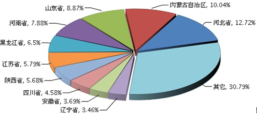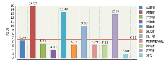 从食品行业主营业务收入地区分布情况看完成主营业务收入情况比较好的地区有山东、河南、广东、天津、福建、湖北省、四川省等省市。其中:山东省共完成主营业务收入1468.65亿元,占食品行业收入总额的12.5%,同比增长6.29%;河南省完成1440.61亿元,12.26%,同比增长14.89%;广东省完成932.82亿元,7.94%,同比增长5.54%;天津市完成765.15亿元,6.51%,同比增长4%。河南主营收入增速最快。
