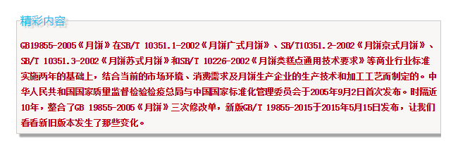 9 、蓉沙类月饼、果仁类月饼、果蔬类月饼、肉与肉制品类月饼、水产制品类月饼、蛋黄类月饼的馅料含量统一调低下限为“ 65.0g/100g ”。