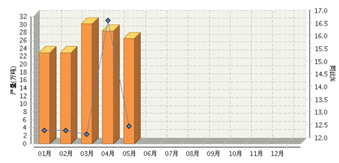 根据国家统计局公布数据, 2015年1月~5月,全国规模以上糖果企业产量119.75万吨,同比增长11.52%。其中:1月份完成产量22.92万吨,同比增长12.52%;2月份完成产量22.92万吨,同比增长12.52%;3月份完成产量30.14万吨,同比增长12.38%;4月份完成产量28.34万吨,同比增长16.85%;5月份完成产量26.43万吨,同比增长12.69%。2015年月度数据走势及同比增长情况如下图所示。