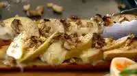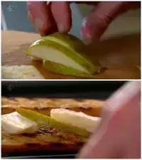 4. 将羊奶酪撕碎,梨子切片放在烤好的法棍上。