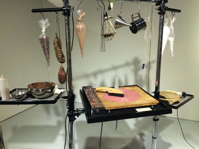 而最有意思的可能是拿巧克力做一张可以播放的黑胶唱片,由设计师和音乐家组合,他们在法国一个剧场现场完成了这次创作,播完音乐还请大家来吃掉巧克力唱片。现场展出的是当时所有的制作工具,很多还留着巧克力的痕迹,我们只能通过墙上的 video 来观看当时的表演。