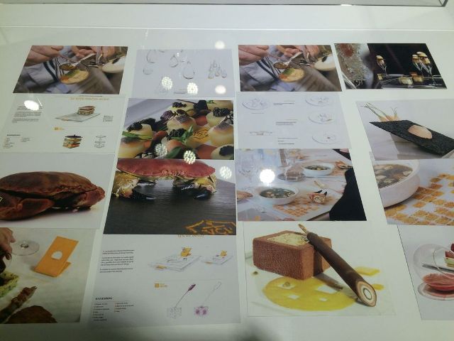 右手边展区会看到 Marc 最赏识的一位学生 Germain Bourre 的作品,他曾经为法国众多知名品牌如凯歌香槟、法芙娜巧克力、乐芝牛等创造广告词,创作艺术食品或活动空间。这次展出的是他与法国 LVMH 旗下的凯歌香槟( Veune Clicquot )合作,为众多米其林餐厅设计的菜单内容及装置。以香槟为主题,比如四层的甜点就是模仿香槟种植地区的石灰岩土质。