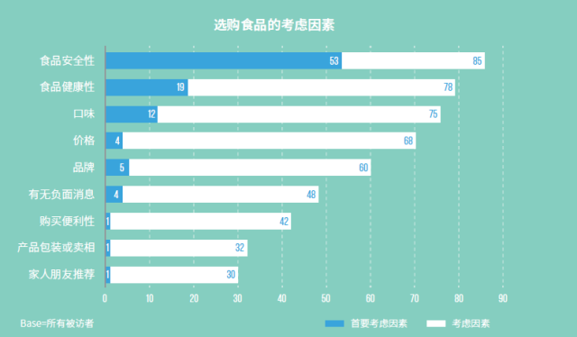 食品安全性是消费者在选购食品 / 外出就餐时最重要考虑因素;同时,食品健康性也是消费者非常关注的一个因素;结合近三年数据来看,消费者对总体食品安全的关注度呈持续上升趋势;