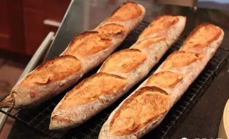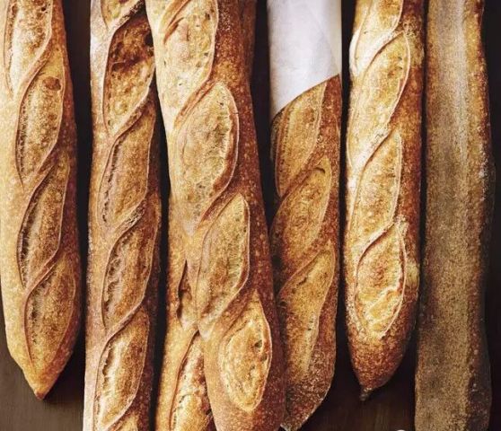 3.划痕:baguette最有意思的恐怕就是上面一道道的划痕,划得好的才能出耳。划痕的作用是在于让面包在烘焙过程中按照划痕的纹路膨胀,这样才能保持造型。要出耳不光光是划一刀那么简单,角度和深度都是有讲究的。出耳的前提条件是面团揉的好,在面包成型的时候就一定要有足够的表面张力,这样刀才能划得不拖泥带水。好的耳应该能够让面包在炉里充分膨胀,拉开面筋。最后的成品给人一种鼓胀欲裂的视觉冲击。好面包应该可以提着耳把面包拎起来。