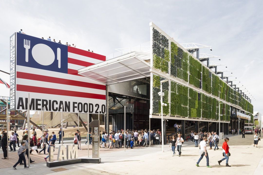 美国馆这回的主题是“美国食物 2.0”(可以称的上是互联网+……)的外立面是非常炫目的垂直农场,一整面 600 多平方米的墙上密密麻麻种植了 42 种作物,包括谷物、蔬菜、香料等,展示更为节约空间的食品生产解决方案。