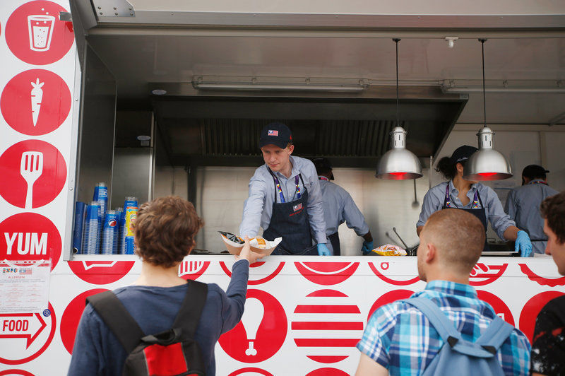 美国馆旁边是定制的几辆食品卡车(food truck),这也是风靡了能有三五年的形式,让厨师或创业者有更平等地加入餐饮世界的机会,也让食物以更具灵活性的方式在城市里缔造自己的地景。这些卡车会在场馆里销售各种精心制作的小吃,比如龙虾卷、烤肉等,展示现代美国菜的面貌。