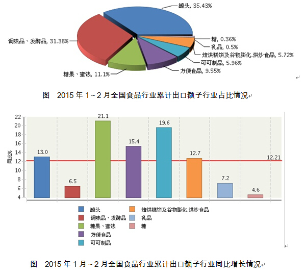 从各子行业出口情况来看,罐头累计出口额5.24亿美元,占食品行业出口总额的35.43%,同比增长13.05%;调味品、发酵品累计出口4.64亿美元,占31.38%,同比增长6.49%;糖果、蜜饯累计出口1.64亿美元,占11.1%,同比增长21.08%;方便食品累计出口1.41亿美元,占9.55%,同比增长15.39%;可可制品累计出口0.88亿美元,占5.96%,同比增长19.59%;焙烘糕饼及谷物膨化.烘炒食品累计出口0.85亿美元,占5.72%,同比增长12.73%;乳品累计出口0.07亿美元,占0.5%,同比增长7.16%;糖累计出口0.05亿美元,占0.36%,同比增长4.6%。