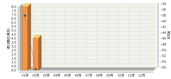根据国家海关公布数据,2015年1~2月,全国食品行业累计完成进口额12.03亿美元,同比下降44.78%。其中:1月份完成进口额8亿美元,同比下降37.05%;2月份完成进口额4.04亿美元,同比下降55.57%。2015年月度数据走势及同比增长情况如下图所示。