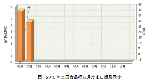 根据国家海关公布数据, 2015年1~2月,全国食品行业累计完成出口额14.79亿美元,同比增长12.21%。其中:1月份完成出口额8.27亿美元,同比增长-4.66%;2月份完成出口额6.52亿美元,同比增长44.63%。2015年月度数据走势及同比增长情况如下图所示。