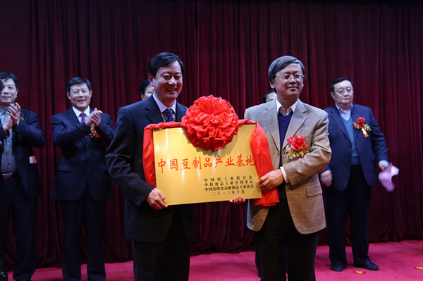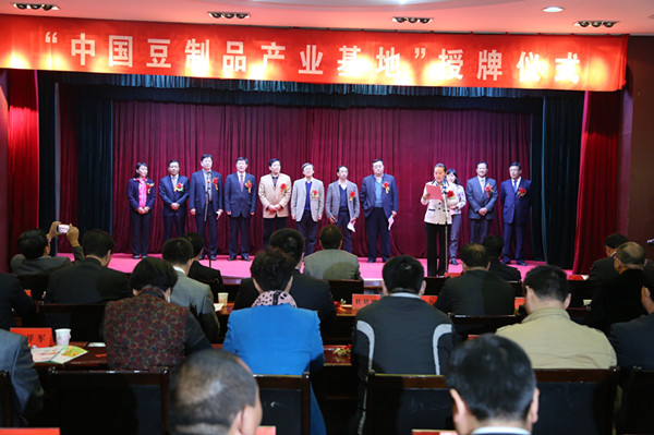 中国焙烤食品糖制品工业协会副秘书长张九魁宣读了《中国轻工业联合会关于授予山东省枣庄市山亭区“中国豆制品产业基地·枣庄山亭”称号的通知》,山东省轻工业协会副会长朱维平致贺辞,中国轻工业联合会副秘书长于学军授予山亭区政府“中国豆制品产业基地”匾牌。