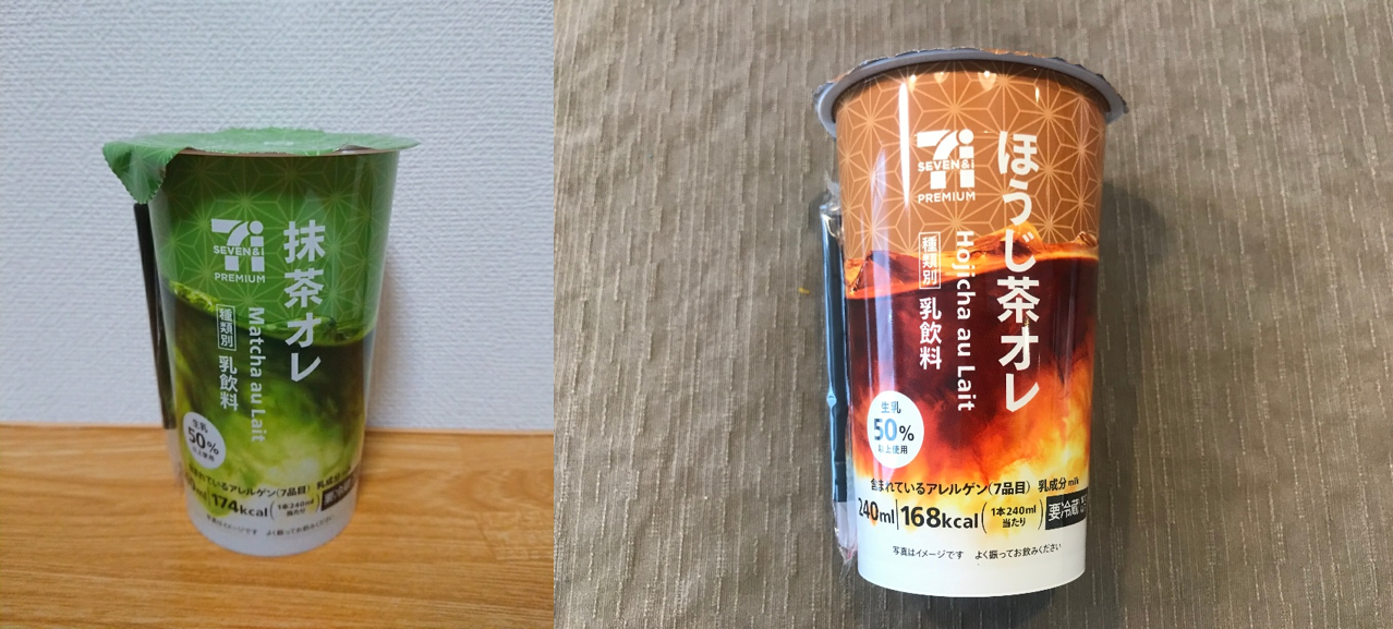 牛奶饮品:セブンプレミアムシリーズ ほうじ茶オレ、抹茶オレ 焙茶、抹茶味